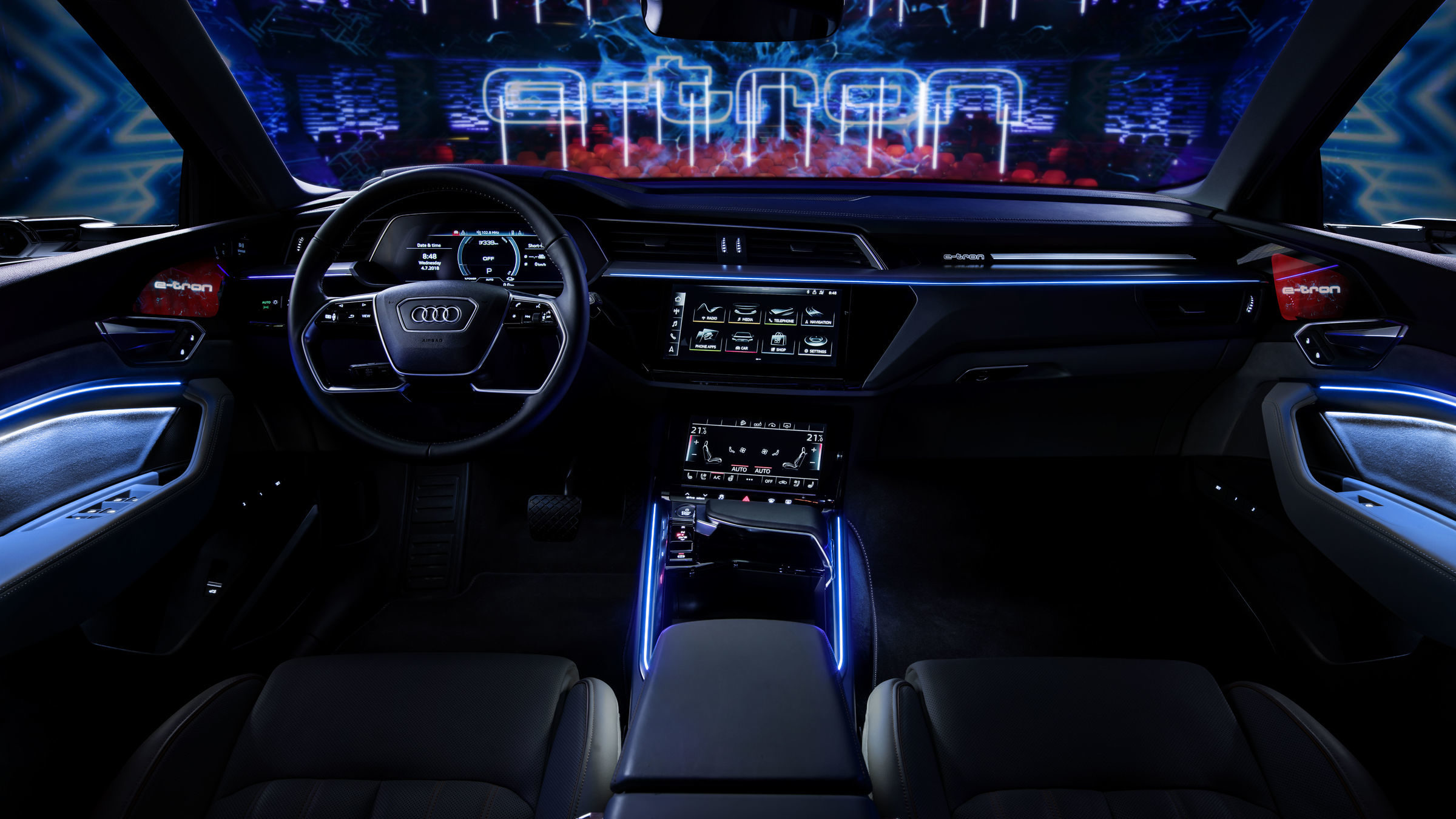 Die Bühne im Interieur des Audi e-tron-Prototypen bildet ein großer Bogen, der »Wrap-around«. Er umspannt die weitläufige Instrumententafel mit ausgeprägt horizontalen Linien bis zu den skulptural gestalteten Türverkleidungen. Dabei integriert er auf harmonische Weise die Hutze über dem serienmäßigen Audi virtual cockpit, dessen schlankes Display optisch frei im Raum steht, sowie die Bildschirme der optionalen, virtuellen Außenspiegel. In der Serienversion des Audi e-tron-Prototypen geben sie ihre Weltpremiere. Damit erreicht die Digitalisierung im Auto ein neues Niveau.