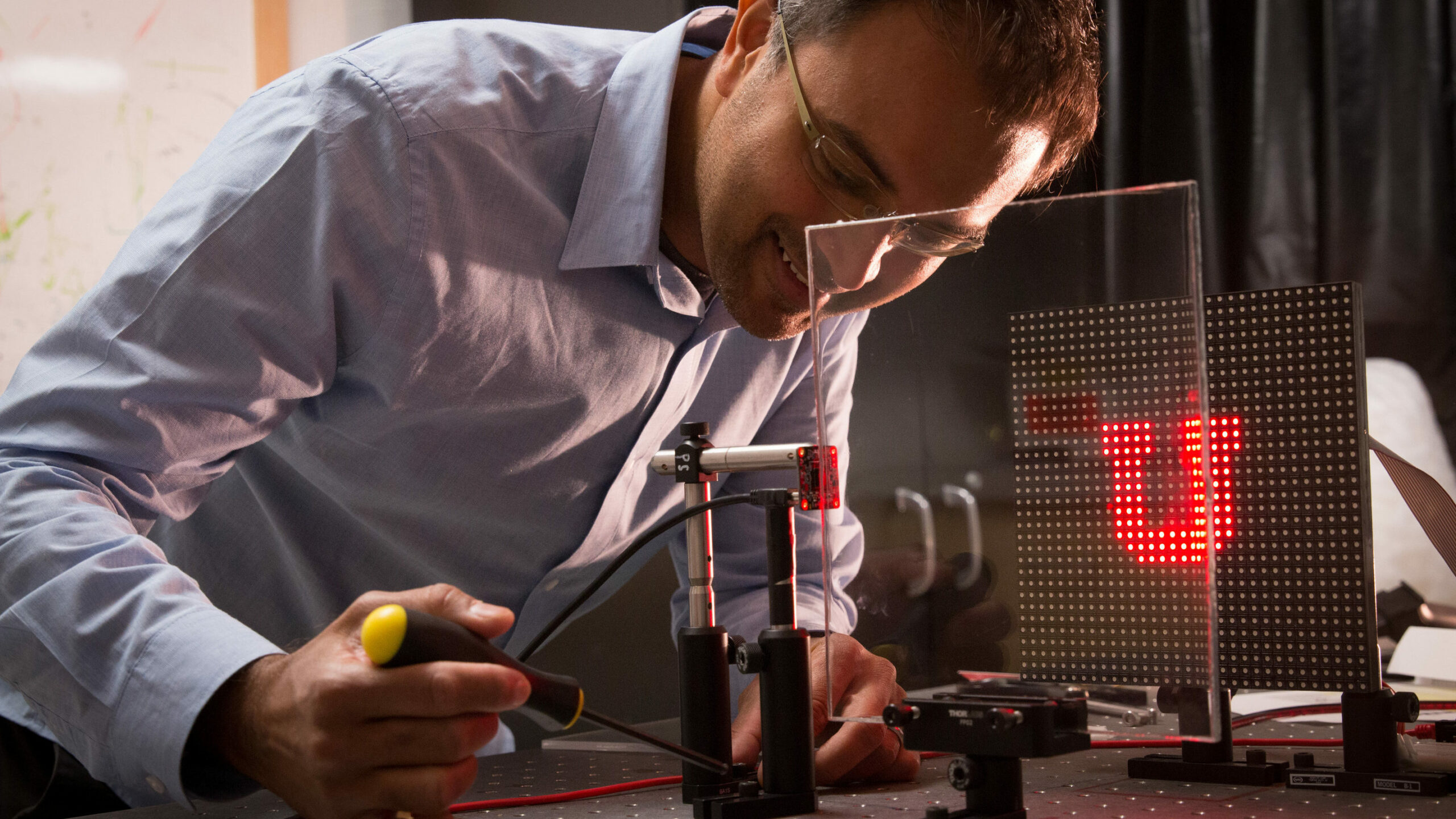 In Experimenten haben die Wissenschaftler Aufnahmen des „U“-Logos der University of Utah sowie eines Strickmännchens auf einer LED-Tafel gemacht. Dabei war ein handelsüblicher Bildsensor mit der Seite einer Plexiglasscheibe verbunden. Die Scheibe stand parallel zur LED-Tafel, der Sensor im rechten Winkel dazu. Doch dank eines von den Forschern entwickelten Algorithmus liefert der Bildsensor eine zwar unscharfe, aber eindeutig erkennbare Aufnahme. Das funktioniert auch in Farbe sowie als Video, so Menon.