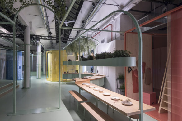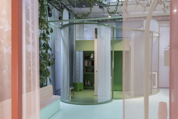 Die diesjährige Mini Living Installation selbst befindet sich in einem anliegenden Raum des Gebäudekomplexes in der Zona Tortona: Die Besucher – eben selbst noch Architekten – erleben dort die lebensgroße Umsetzung von vier unterschiedlichen Wohnraumkonzepten, die in Kooperation mit dem Londoner Designbüro Studiomama gestaltet wurden. Mit nur 15 bis 20 Quadratmeter Fläche, aber auf ganz unterschiedlichen Grundrissen und in unterschiedlichen Formen, Farben und Materialien zeigen sich hier vier verschiedene Wohneinheiten. Diese bringen so nicht nur die einzelnen Persönlichkeiten ihrer Bewohner zum Ausdruck, sondern zeigen gleichzeitig die Vielfalt und Bandbreite dieses Konzepts. Die Wohneinheiten sind eingebettet in einen gemeinschaftlich genutzten Raum, in dem exemplarische Funktionen wie eine Gemeinschaftsküche, ein Fitnessbereich und ein Atrium integriert sind. Dabei nutzt die Installation die vorhandene Struktur des Raumes wie Stützen und Streben und erweitert sie um zusätzliche Funktionalitäten. So entsteht eine eigene, lebendige Mikronachbarschaft in einer alten Fabrikhalle. Zugleich weckt die Installation das Bewusstsein dafür, dass selbst das Innere eines leer stehenden Gebäudes für die Zukunft urbaner Architektur genutzt werden kann. Nicht genutzte Warenhäuser, leer stehende Einkaufszentren oder Büros könnten dadurch zukünftig zu potenziellem Wohnraum werden.